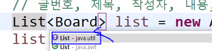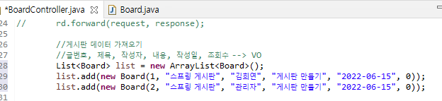생성자 두개에 값을 임시로 지정하여 Board타입 리스트에 담아준다.