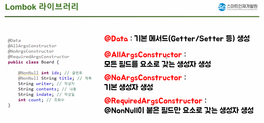 - RequireArgsConstructor : 필요한 필드만 요소로 갖는 생성자